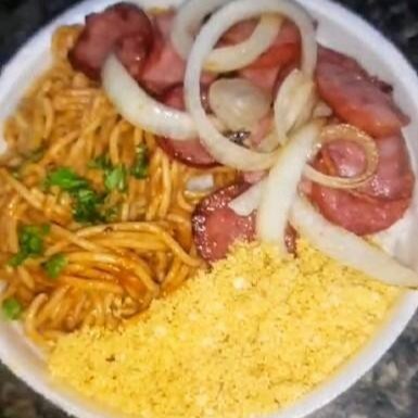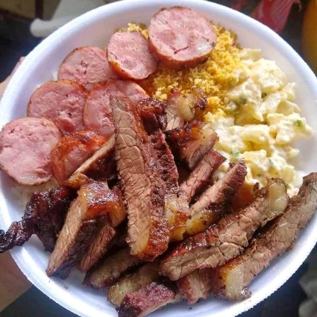 Mix de carne na chapa,cortada em tiras linguiça calabresa!!! Nao e toscana ,arroz , feijão,maionese e farofa tudo juntinho em uma marmita
