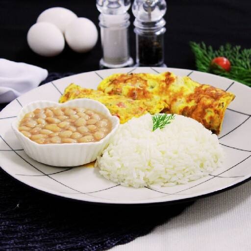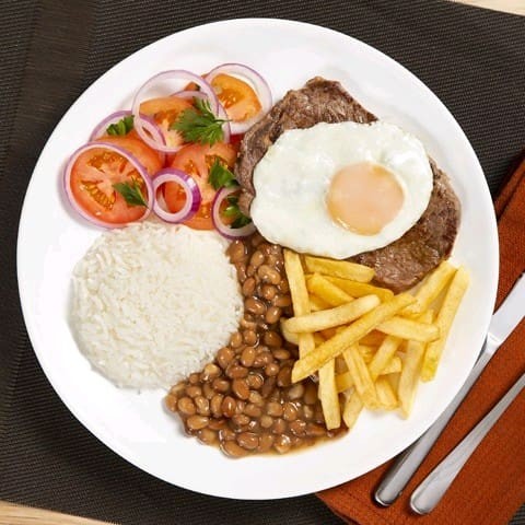 Contem um bife ,ovo ,arroz, feijão e salada