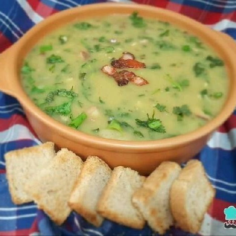 Caldo verde preparado com creme de mandioca com pedaços de linguiça calabresa, couve picadinha para dar aquele frescor e corânica e tempero naturais acompanhando com torrada ou pãozinho cortado sempre estou vareando