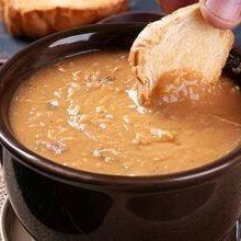 Caldo de feijão carioca cremoso preparado com alho, cebola, cheiro verde, feijão carioca, calabresa, bacon, louro, pimenta do reino, pimenta calabresa e azeite de oliva acompanhado com torrada