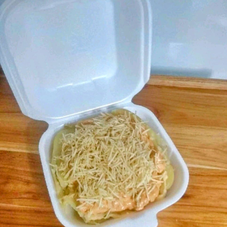 Escondidinho com base de batata recheado de calabresa ralada com queijo e finalizado com queijo,oregano e queijo ralado na marmita de 750 g obs imagem meramente ilustrativa