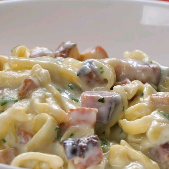 Macarronada Ao Molho Branco Com Bacon E Queijo