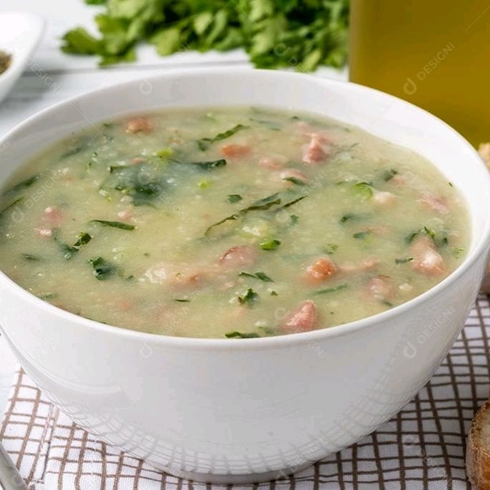Delicioso caldo verde com base de mandioca e batata com couve ,alho,cebola,cheiro verde ,e ingredientes naturais acompanha torradas ou pãonzinho cortado sempre estou vareando 750 ml cada totalizando 1500 ml