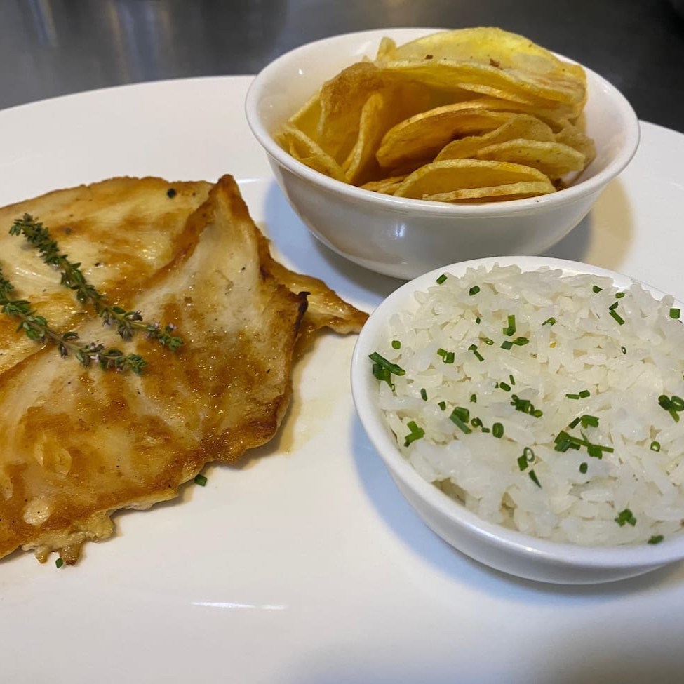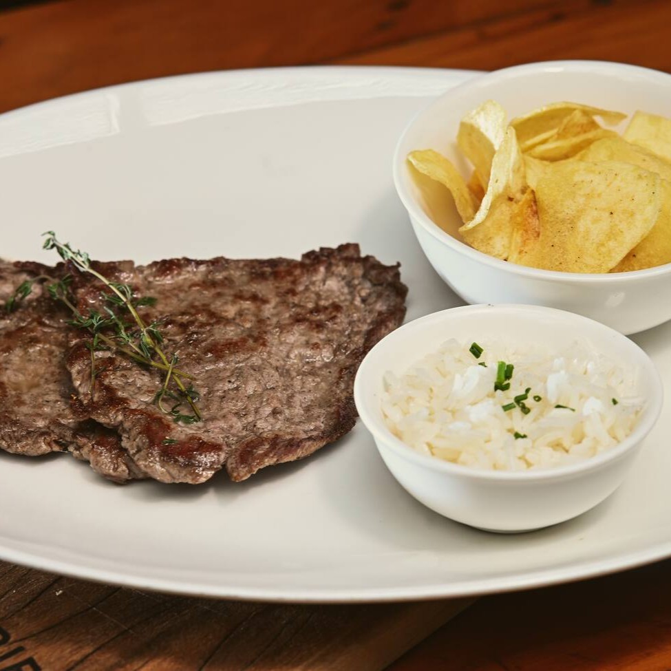 Escalope de filet mignon (aprox. 125gr), batata chips e arroz branco.