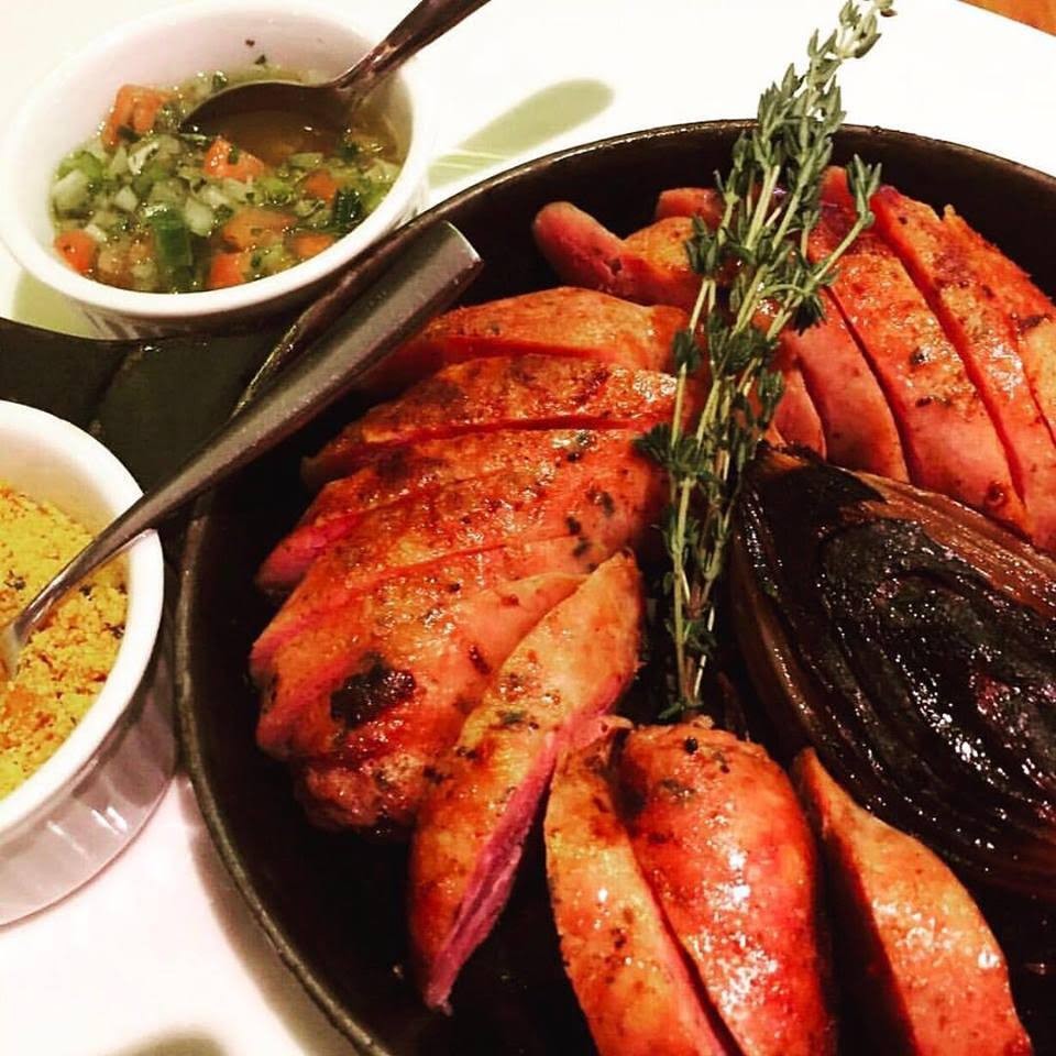 Linguiça chistorra picante, assada na chapa. Acompanha Farofa Crocante E Vinagrete