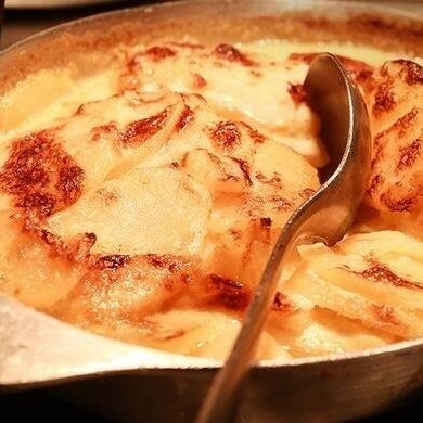 Batata asterix em lâminas, gratinada com creme de leite fresco e noz noscada.
