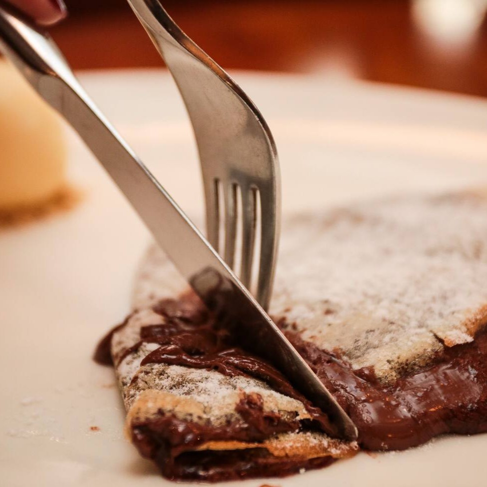 Crepe recheado com Nutella, acompanha sorvete de baunilha.