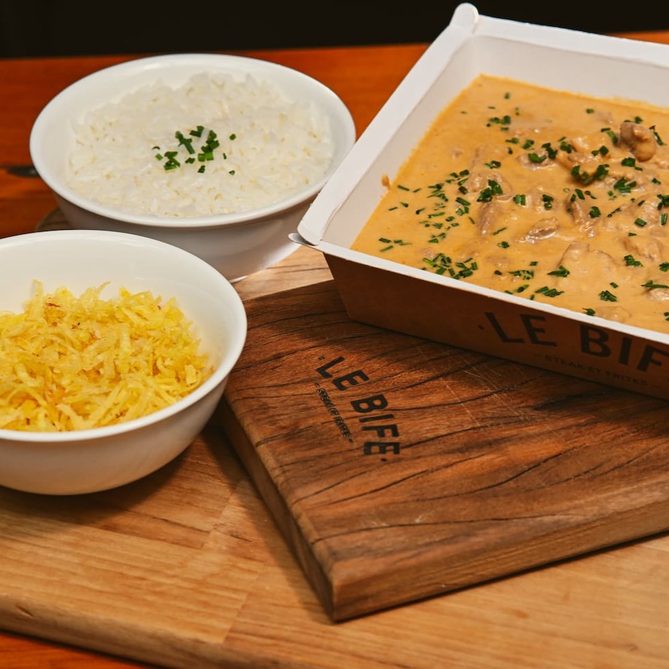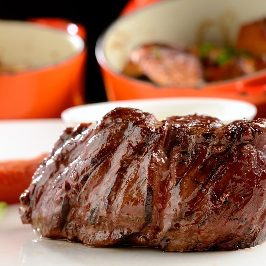 Coberto com molho marchand du vin (base de molho roti + vinho tinto), acompanha batata gratin (200grs) (a quantidade da carne crua, varia de acordo com o ponto do corte) e farofa crocante