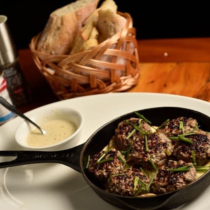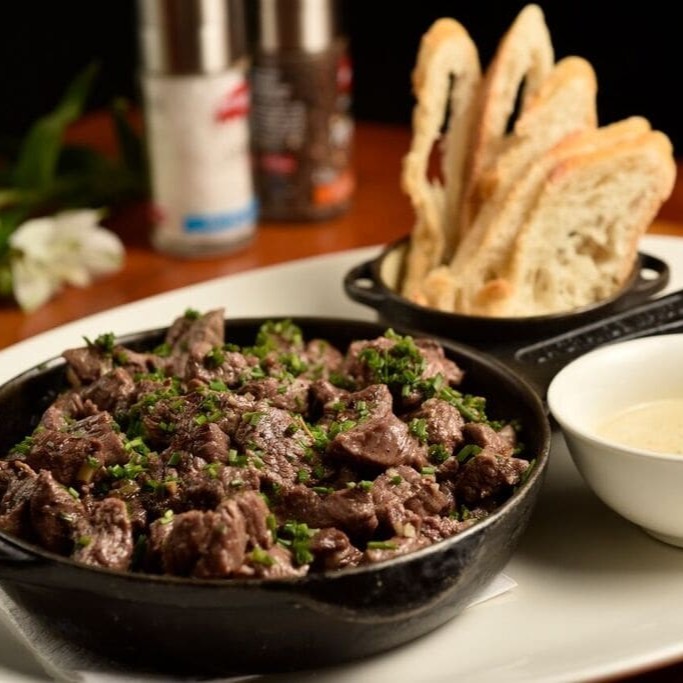Cubos de filet mignon temperados com alho, pimenta do reino, sal e azeite, assados na chapa. Acompanha Torradas da le pain quotidien e Molho De Mostarda.