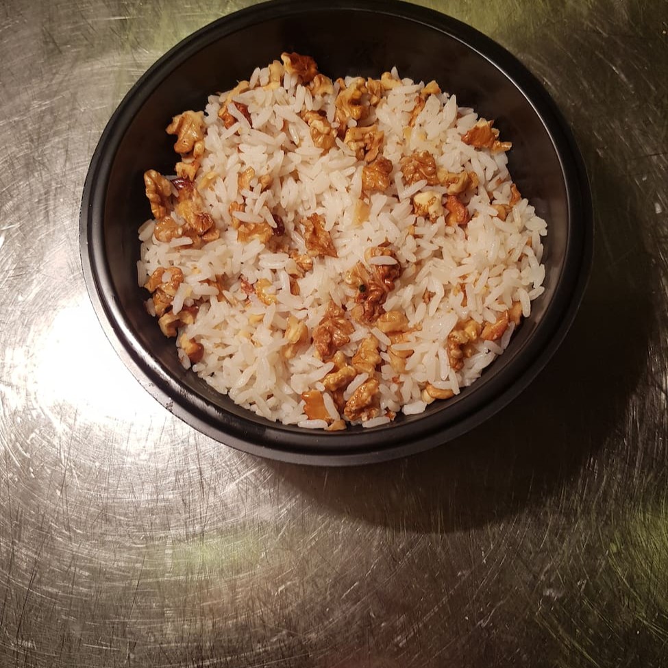 Acompanha molho de queijo roquefort, arroz com nozes e farofa crocante