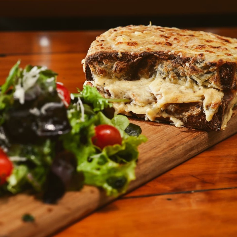 Sanduiche gratinado feito com pão de brioche, queijo gruyere, presunto Royale, mostarda ancienne, molho bechamel e parmesão. Acompanha salada de mix de folhas verdes, parmesão ralado e tomate cereja.