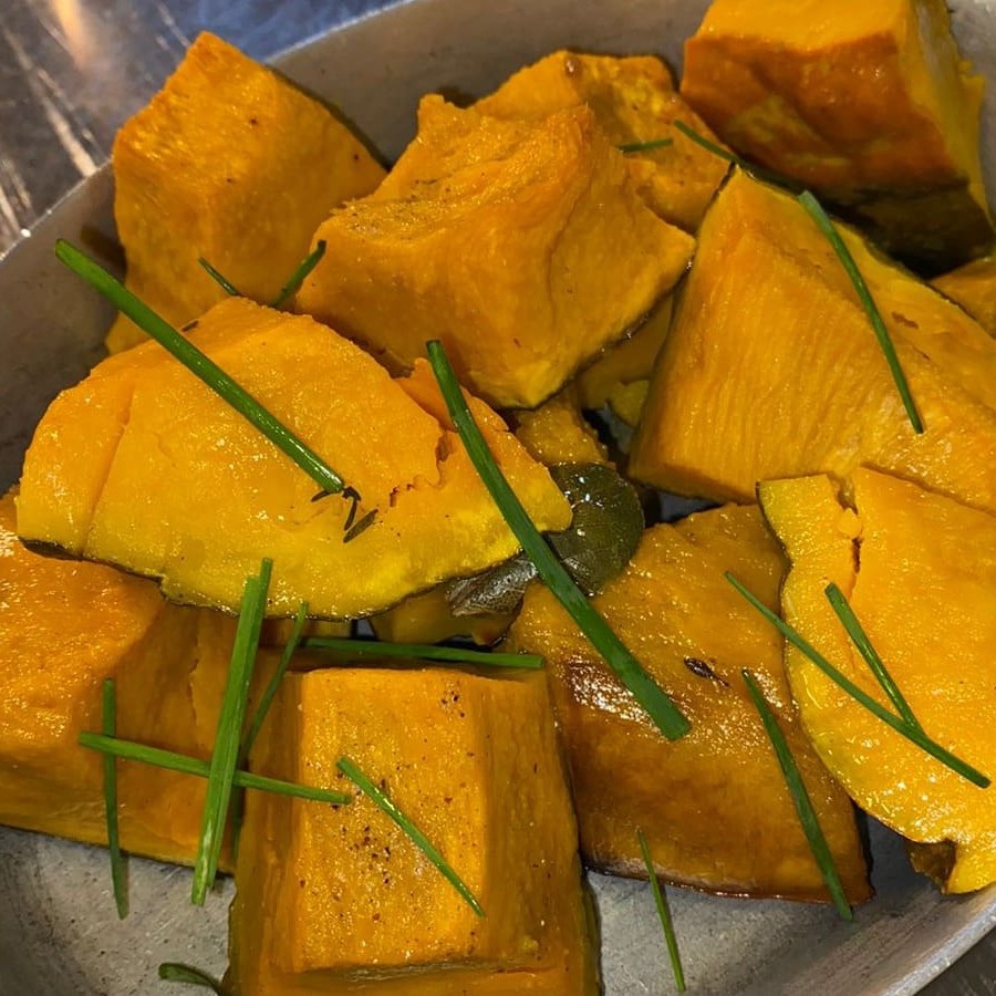 Abóbora cabotiá assada com azeite, sal e tomilho.