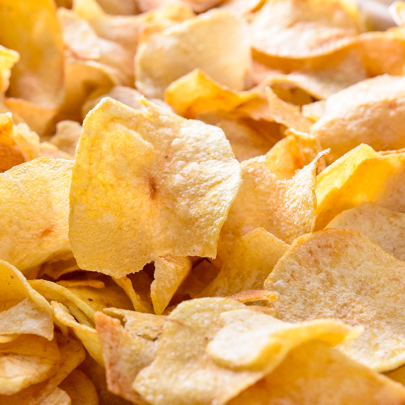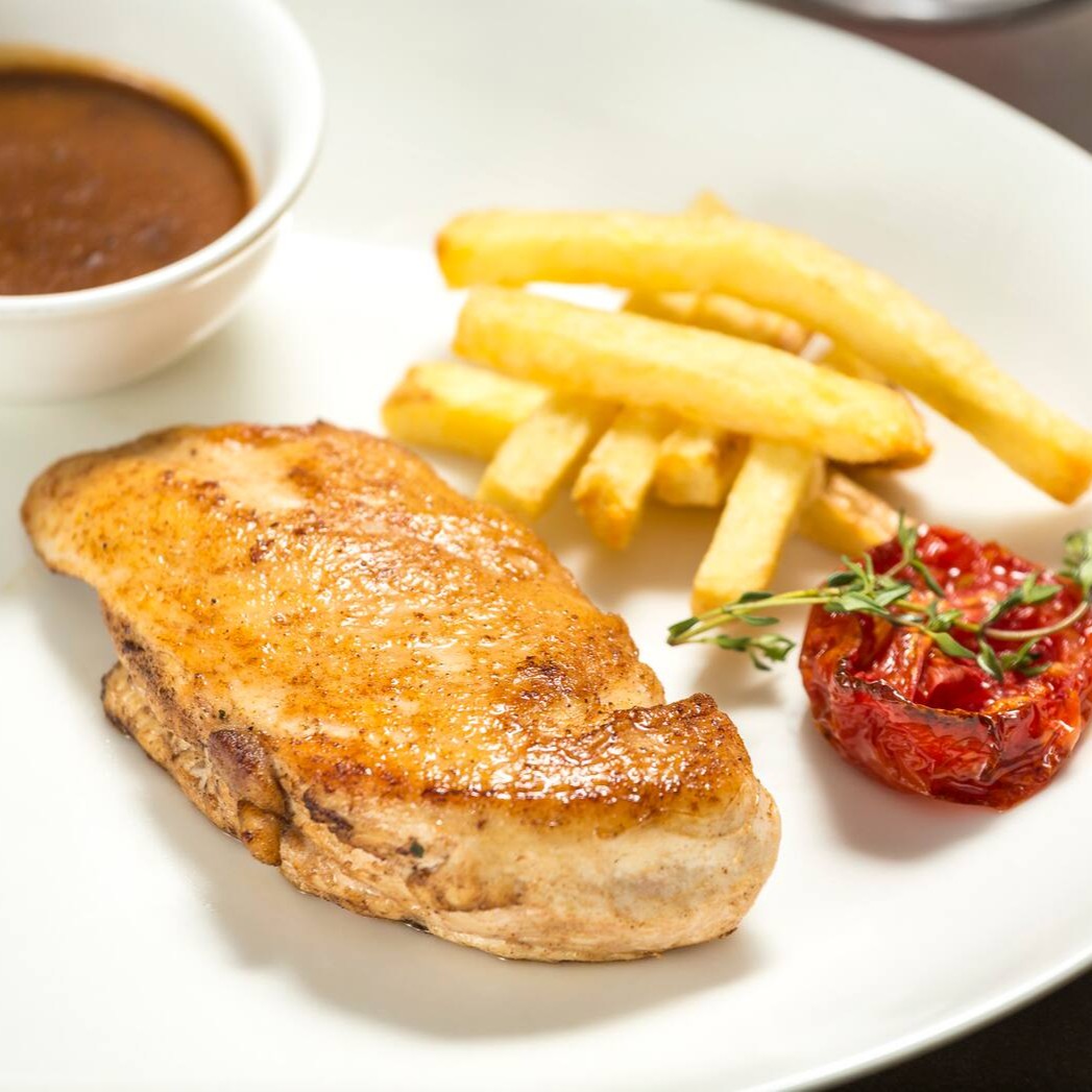 Escalope de peito de frango Korin (aprox 125g), batatas chips e arroz branco.