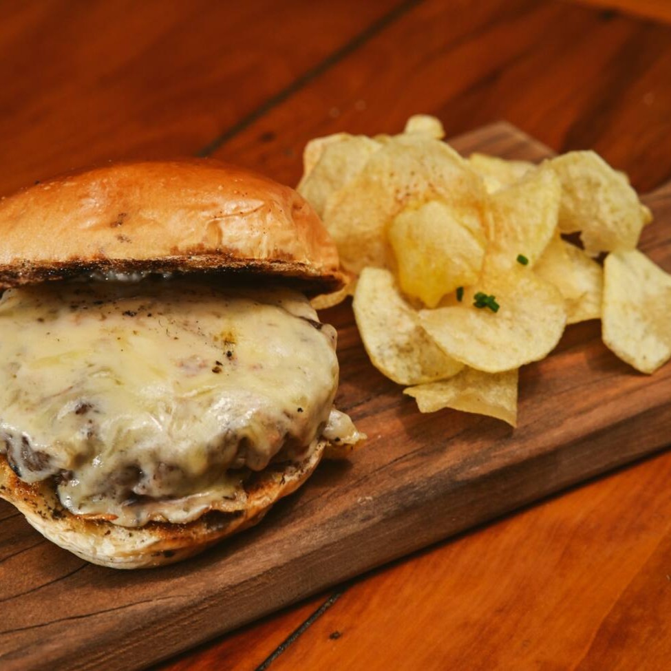 Delicioso Hamburguer bovino (aprox. 180grs) no pão de Brioche e queijo Gruyère. Acompanha batata chips.