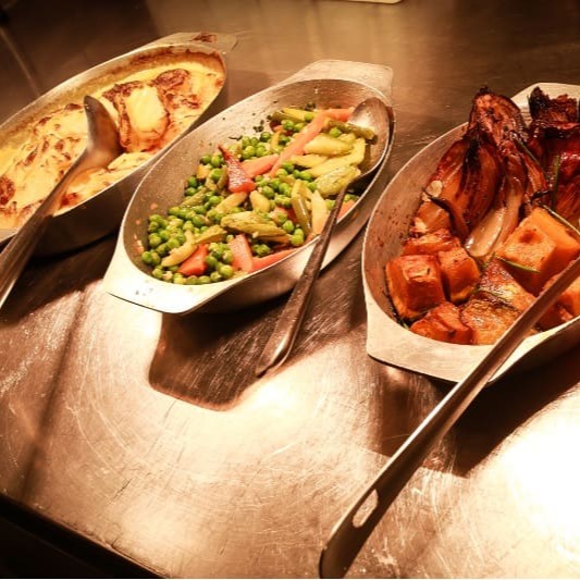 Batata gratin- batata asterix gratinada com creme de leite e noz moscada espinafre cremoso - espinafre cozinho no creme de leite com pimenta do reino branca, nóz moscada e sal legumes da horta - cenoura, vagem holandesa, ervilha, abobrinha salteados no azeite. cebola e abóbora assada