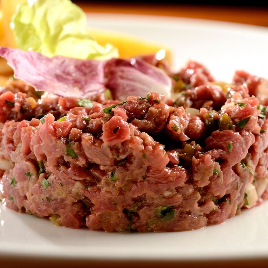 O preferido da casa!! Nosso famoso Steak Tartat, cortado na ponta da faca! Acompanha torrada de baguete e chips pequena.
