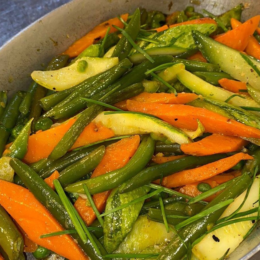 Abobrinha, cenoura, ervilha e vagem holandesa salteados no azeite.
