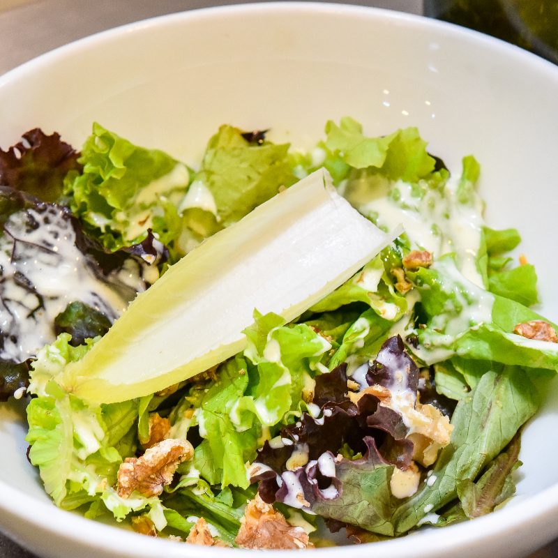 Alface americana, crespa, roxa, frise, rúcula e radicchio, temperada com maionese da casa, azeite de ervas e nozes mariposa picada.