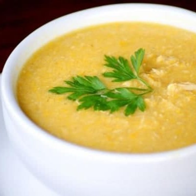 Caldo de mandioquinha com frango desfiado. Embalagem com 550 ml. Não inclui acompanhamento