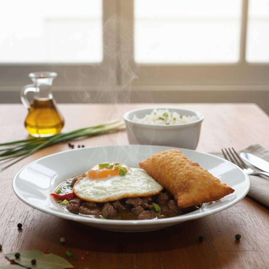Tiras de filet mignon 150g ao molho roti com pimenta biquinho, ovo frito gema mole, pastel de farofa e arroz.