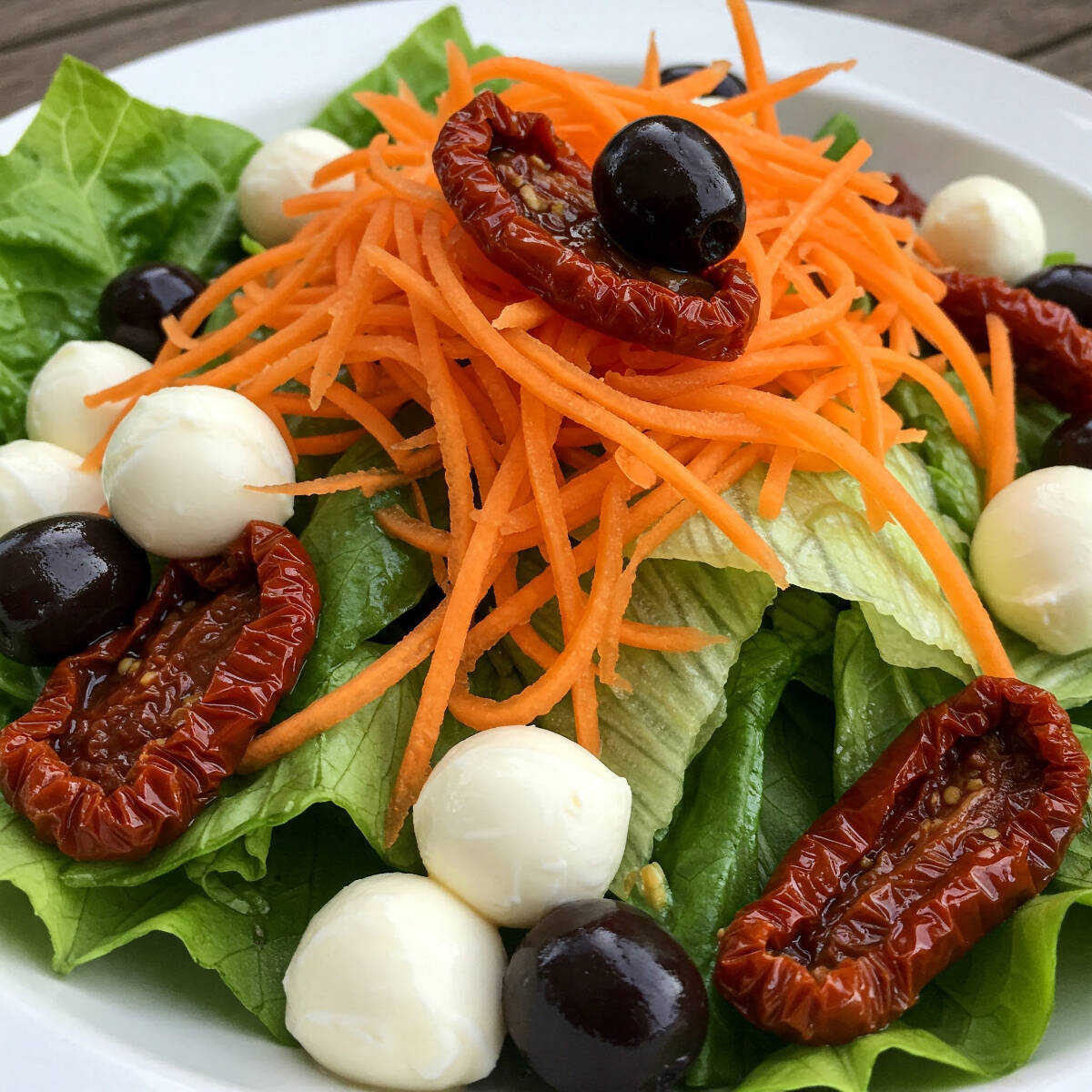 Alface americana, rúcula, cenoura ralada, mussarela de búfala, tomate seco, parmesão ralado e azeitonas pretas.