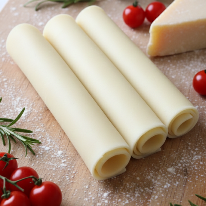 Massa fresca de lasanha, molho bolognesa, molho branco, mussarela e parmesão
