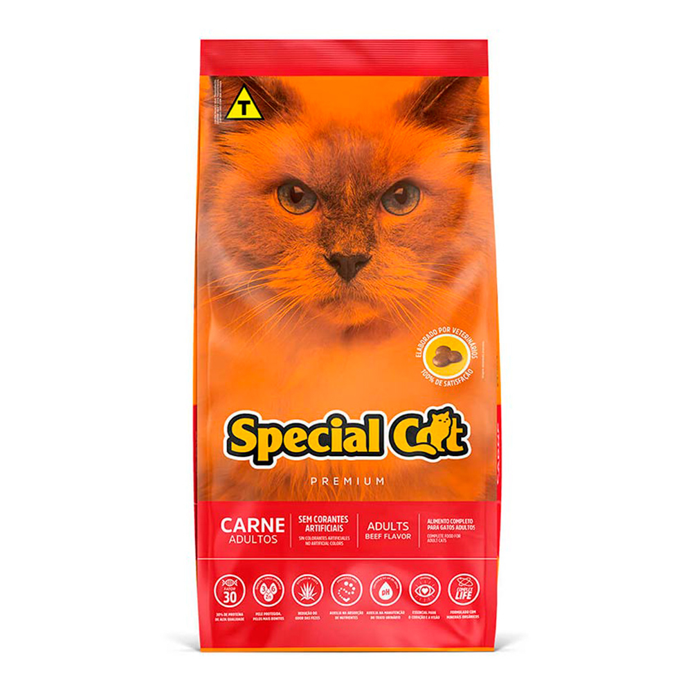 A Ração Special Cat Premium Adultos Sabor Carne 10kg é um alimento completo e balanceado para gatos adultos, destacando-se por conter Ômegas 3 e 6 + Zinco Orgânico para pele e pelos brilhantes, Taurina para saúde cardíaca e visual, Extrato de Yucca para reduzir o odor das fezes, e Prebiótico MOS para melhor absorção de nutrientes e saúde intestinal, sem corantes artificiais, promovendo bem-estar e sabor para seu felino.