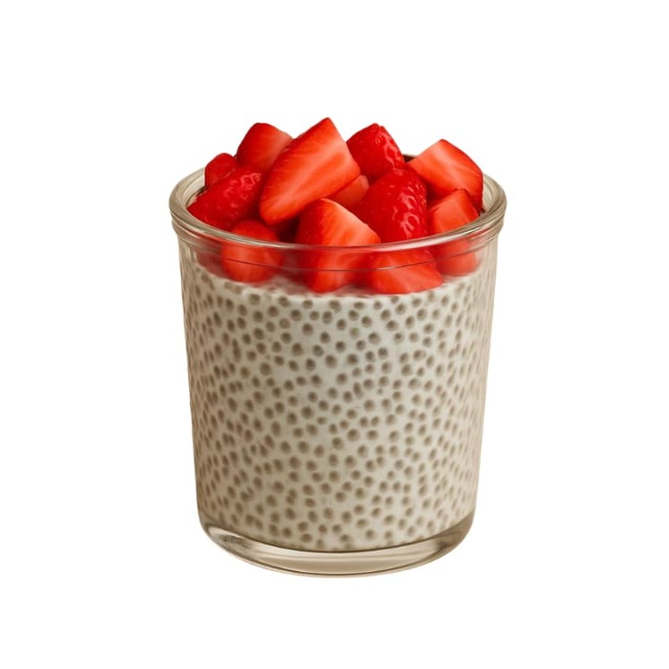 Semente de chia hidratada com leite de amêndoas de baunilha e montada com os toppings de sua preferência. Uma sobremesa leve, nutritiva e cheia de sabor, perfeita para fechar a refeição de forma saudável e refrescante.