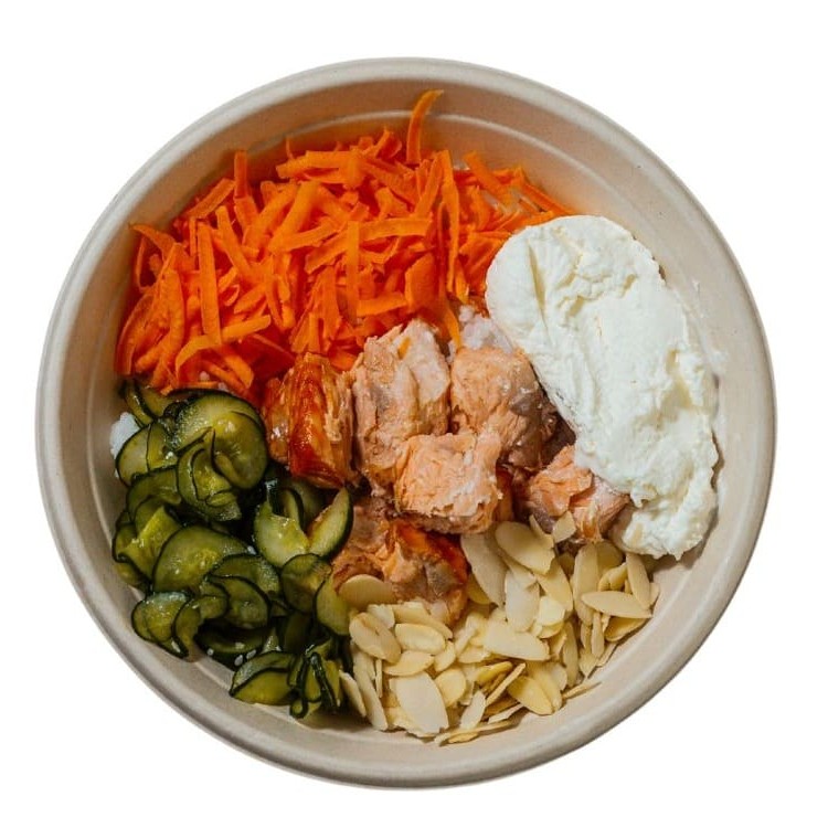 Gohan, salmão ao forno, cenoura, sunomono, cream cheese e lascas de amêndoas.