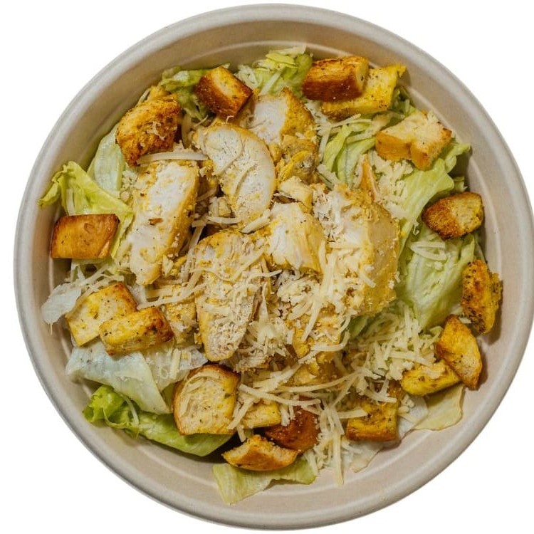 Alface americana, tiras de frango, croutons e parmesão.