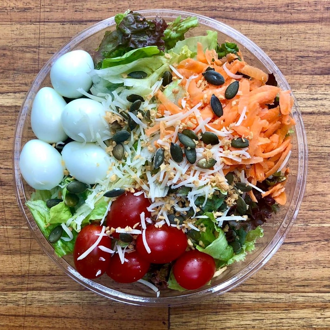 Salada preferida da galera. Selecionamos os toppings mais pedidos e deixamos tudo prontinho para você! ingredientes: • mix de folhas • cenoura ralada • ovo de codorna • tomate cereja • parmesão ralado • alho frito • semente de abóbora • p/ finalizar o molho à sua escolha