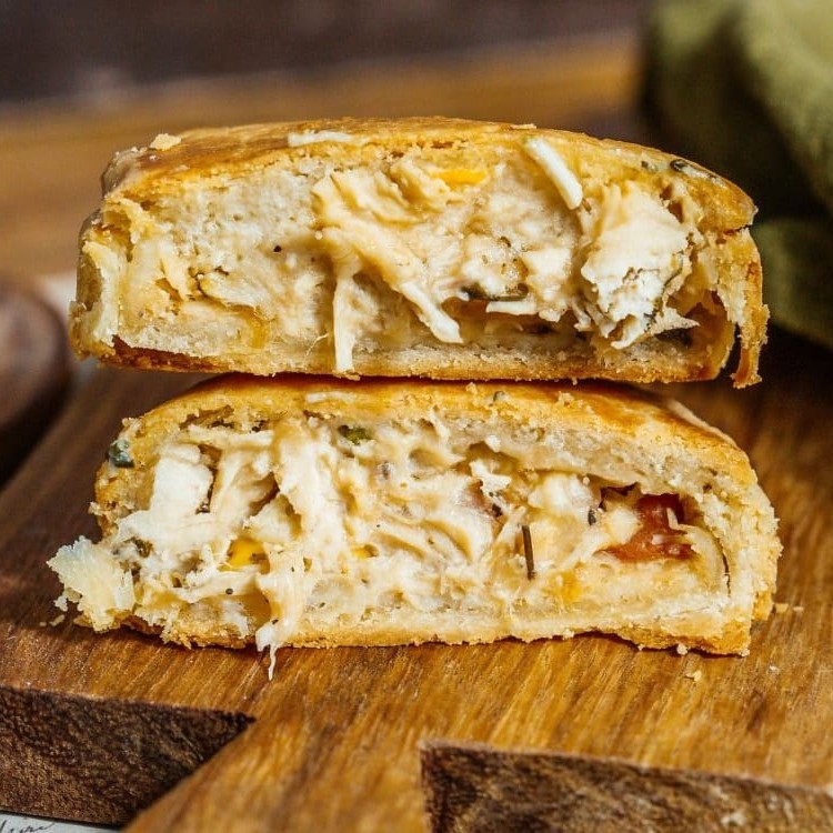 Torta artesanal com massa crocante, recheada com frango desfiado.