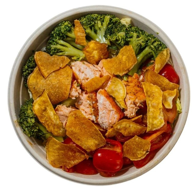 Alface americana, salmão ao forno, brócolis, tomate grape e chips de batata doce.