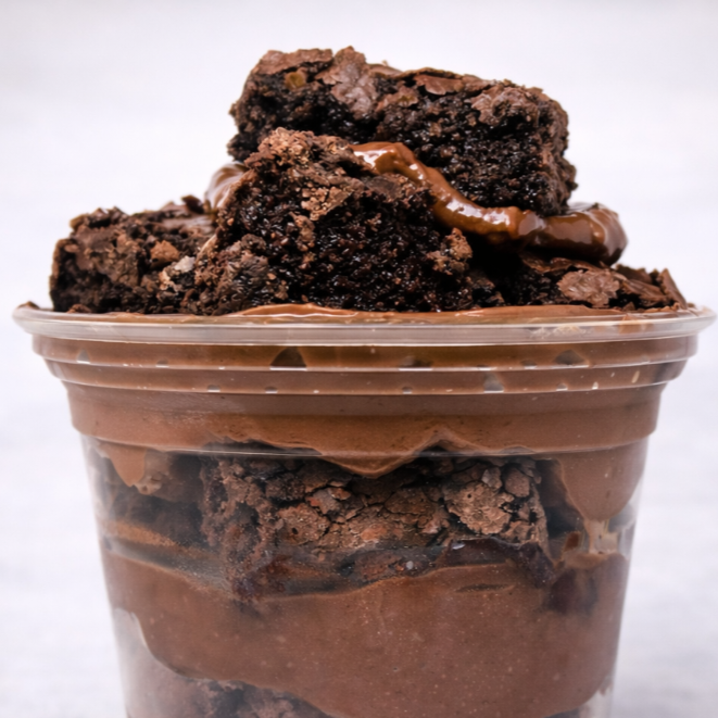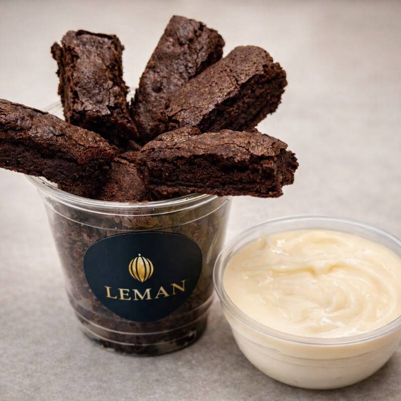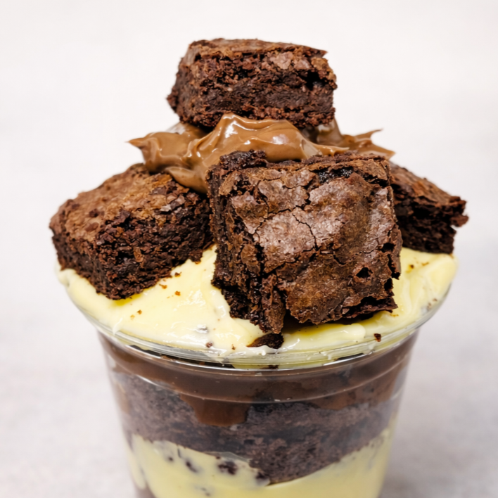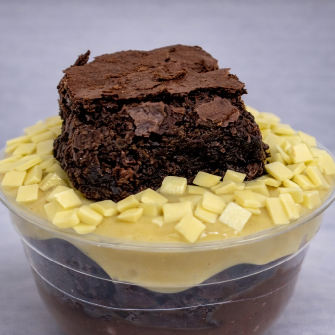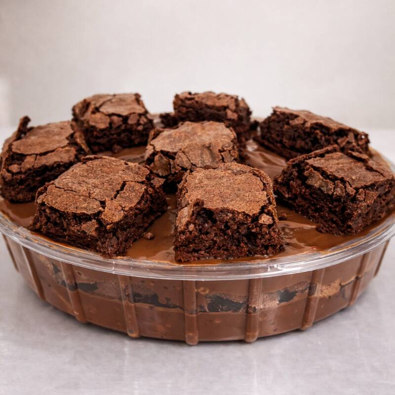 Cubos generosos de brownie macio (200g), acompanhada de 1 complemento cremoso à escolha: Ninho, brigadeiro ou doce de leite.