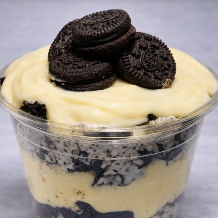 Copo da felicidade de creme de Ninho caseiro em camadas pedaços de bolacha Oreo, finalizado com creme e bolacha.