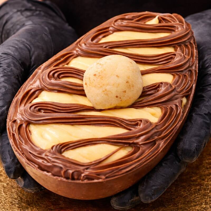 Ovo de chocolate de 300g, recheado com camadas generosas à sua escolha e finalizado do seu jeito. Escolha 1 sabor e 1 cobertura para montar o seu ovo.