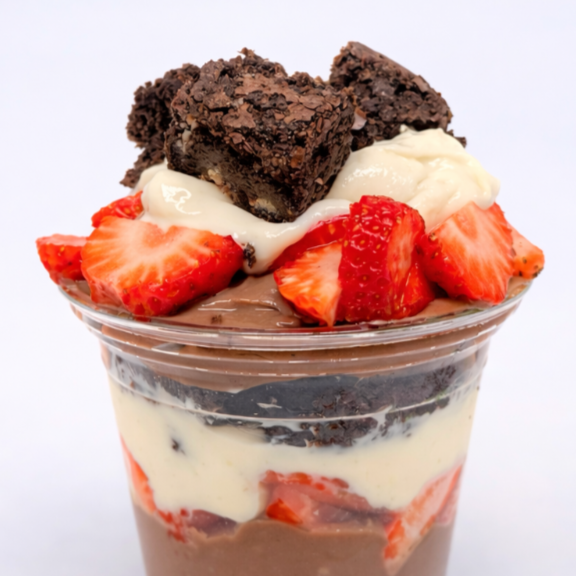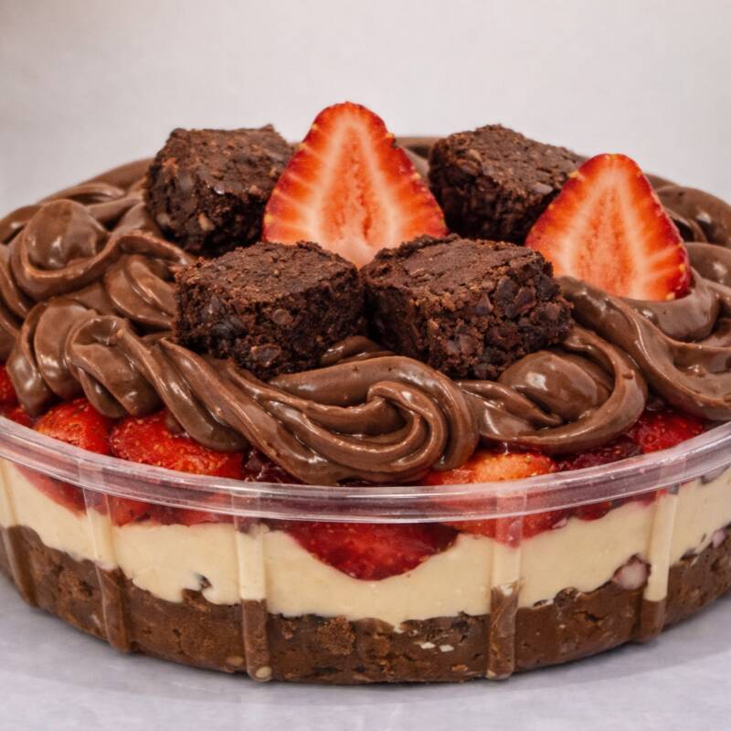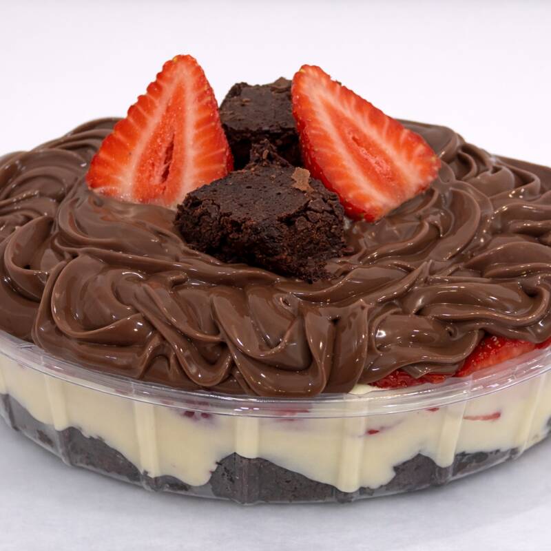 Creme branco caseiro em camadas com morango e brigadeiro, finalizado com brownie macio.