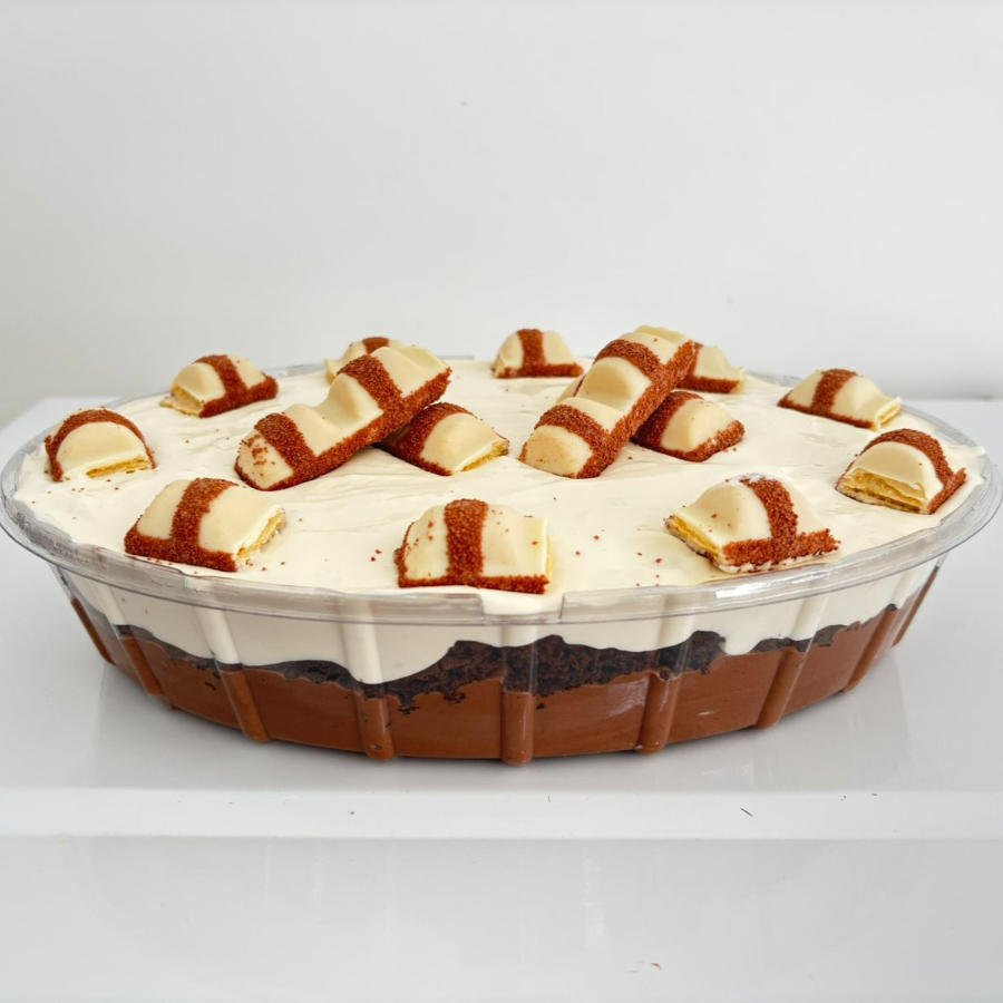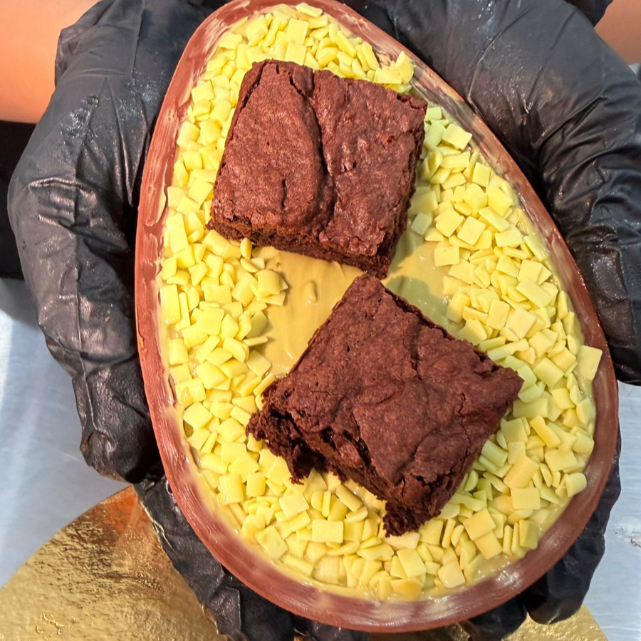 Sobremesa da Pascoa feita com camadas generosas de creme de chocolate cremoso, intercaladas com pedaços de brownie artesanal macio.