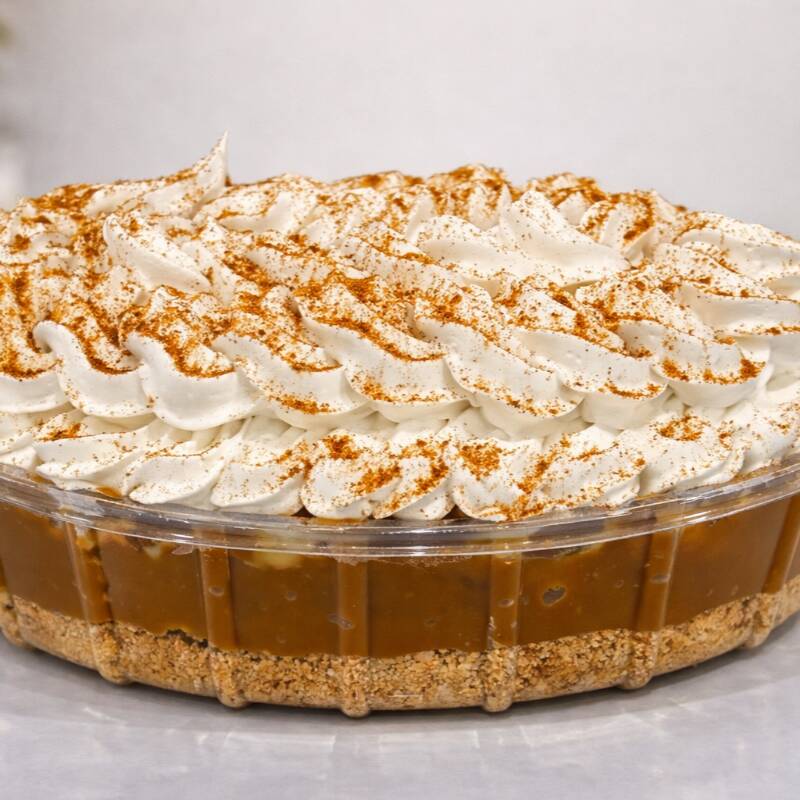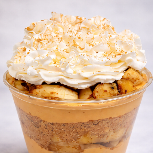 Sobremesa da Pascoa feita com camadas de farofa crocante de maizena, doce de leite cremoso e bananas frescas picadas, com um toque de canela, finalizadas com chantilly.
