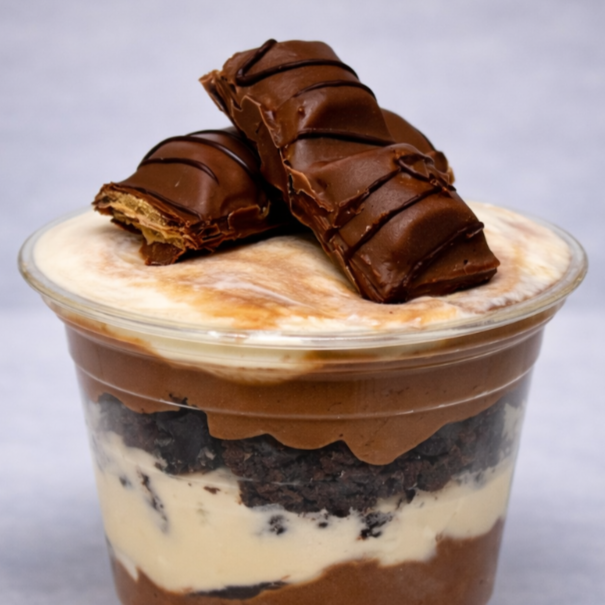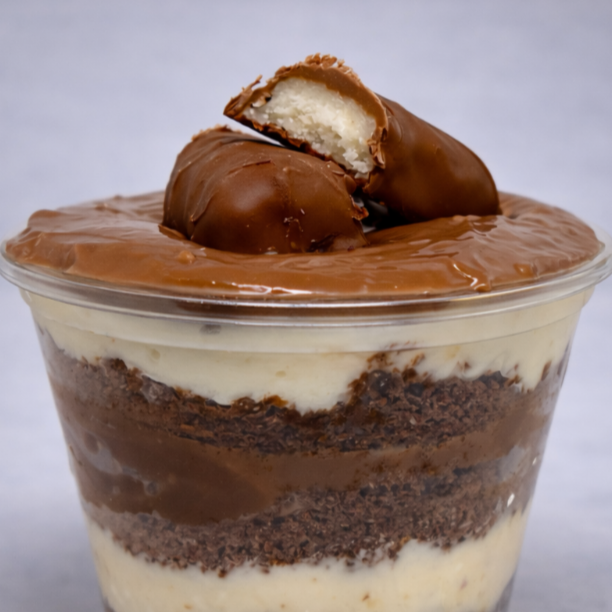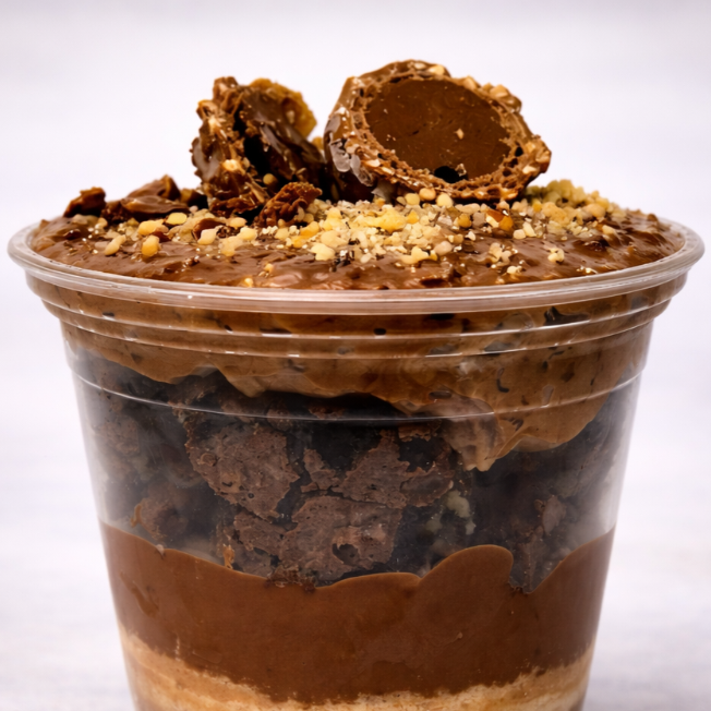 Copo da felicidade coberto com uma camada generosa de Ferrero cremoso e brownie macio, finalizado com farofinha crocante.