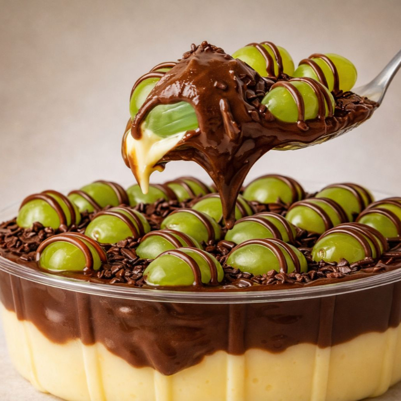 Bombom de Uva preparado com creme branco caseiro em camadas com uvas e brigadeiro.