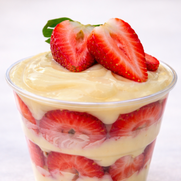 Copo da felicidade de creme de Ninho caseiro em camadas com morango fresco.