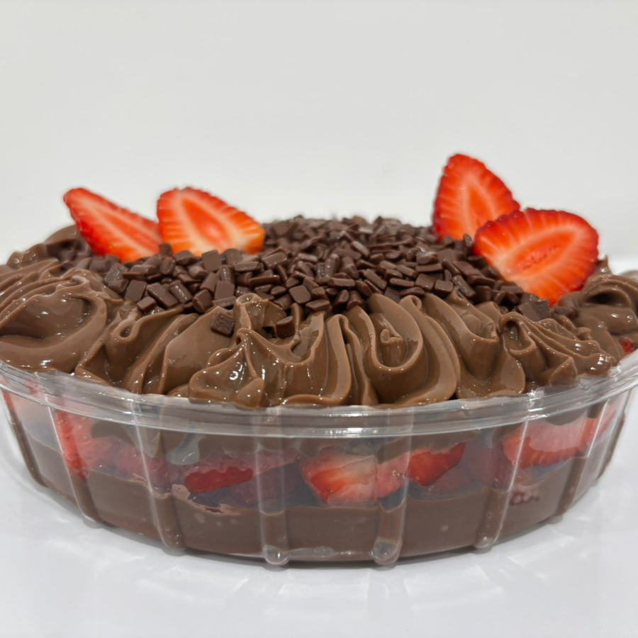 Sobremesa da Pascoa feita com creme de chocolate super cremoso, combinado com morangos frescos e suculentos e ganache aveludada, finalizado com raspas de chocolate, 1,2kg.