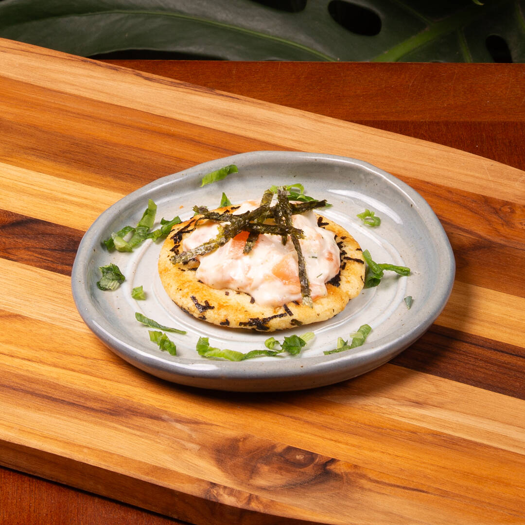 Tartare de salmão cream cheese com um toque de limão e dill, servido sobre um crocante biscoito de arroz e algas. Porção de 30g de salmão.