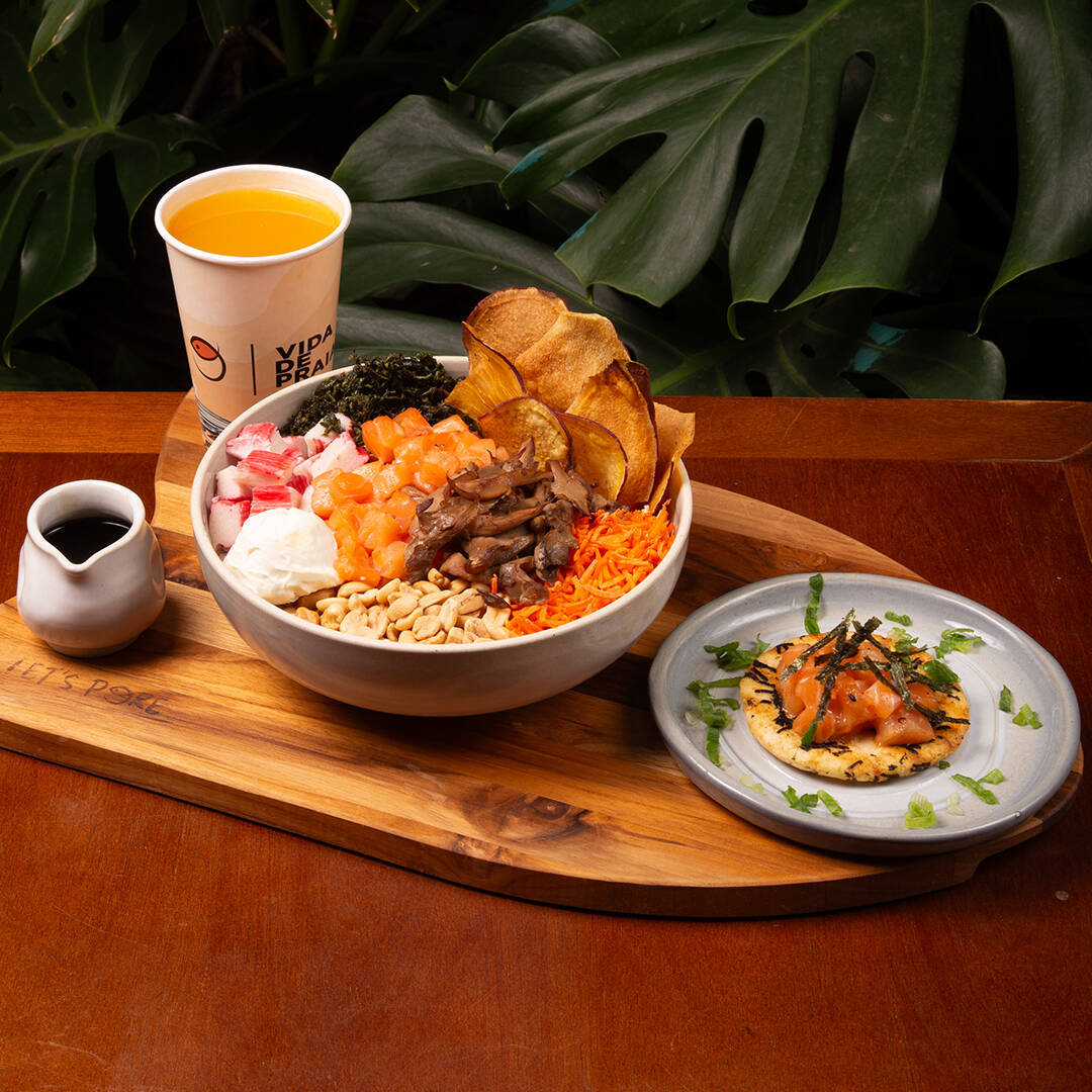 Atum spicy, arroz japonês temperado (shari), arroz negro, abacate, castanha de caju caramelizada, tomate sweet grape, wakame, gengibre e edamame. Molho Let's Poke.