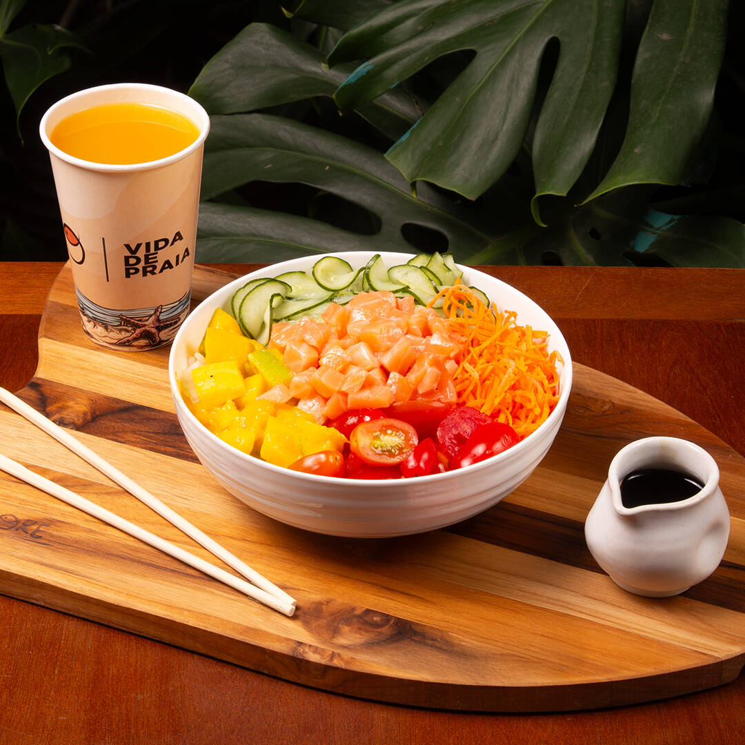 Salmão marinado ao perfeito estilo havaiano (à base de shoyo, óleo de gergelim e nosso tempero secreto - salmão marinado apresenta aroma mais intenso e aparência mais escura), arroz japonês temperado (shari), cenoura, manga, sunomono, crisp de couve e molho Let's Poke. Não é possível trocar nenhum ingrediente neste poke.