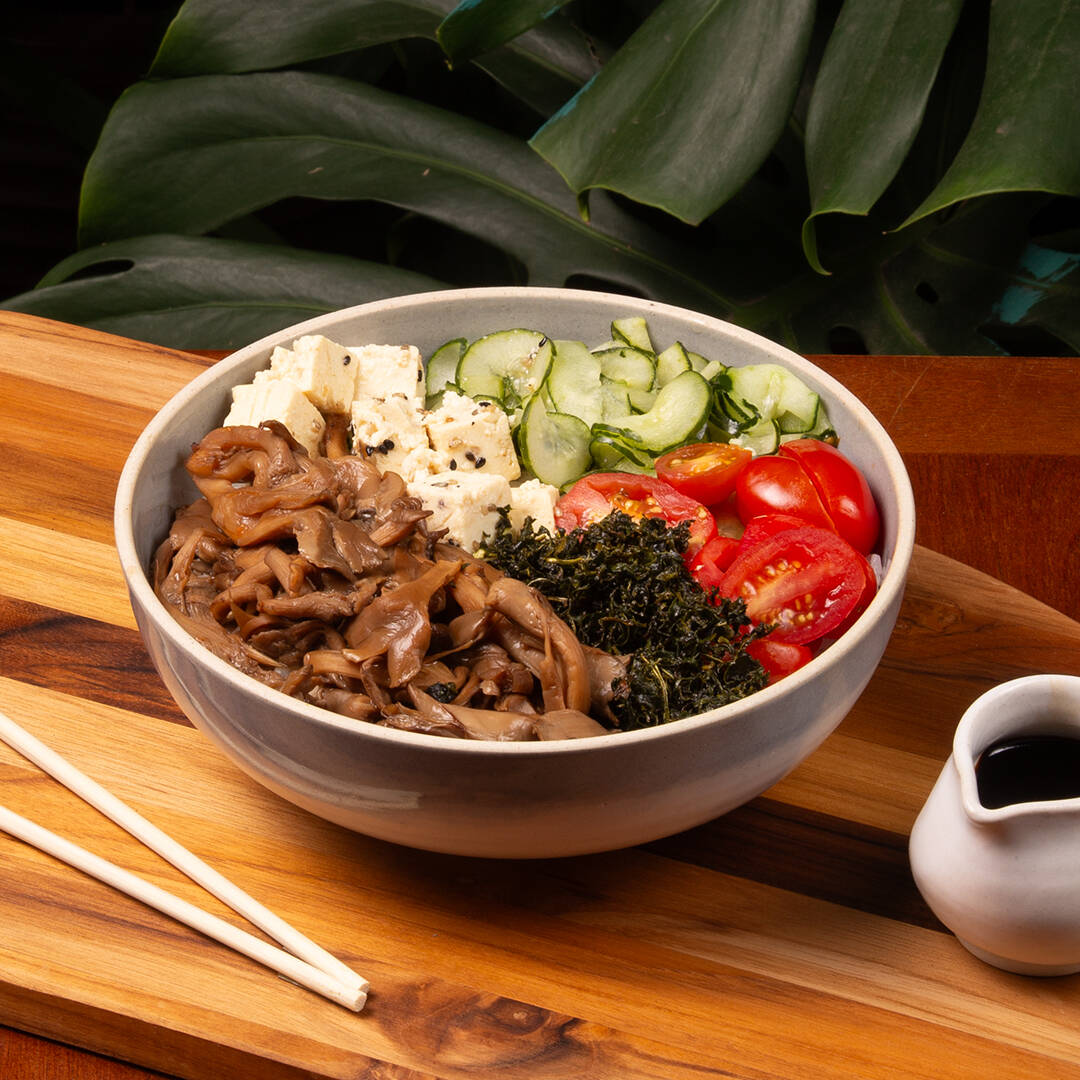 Shimeji grelhado, tofu, arroz japonês temperado (shari), tomate sweet grape, sunomono, crisp de couve e molho tradicional. Não é possível trocar nenhum ingrediente neste poke.