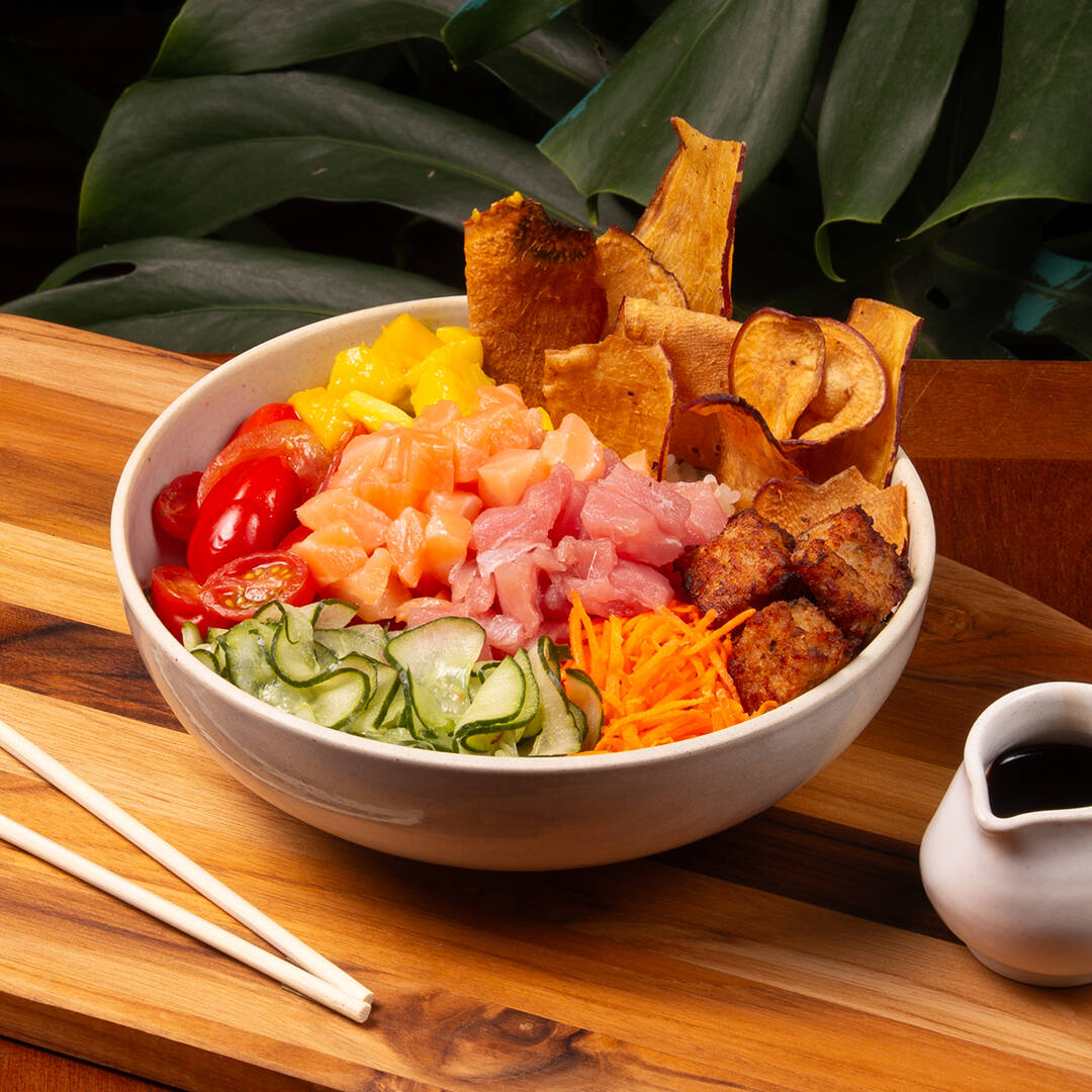 Atum, arroz japonês temperado (shari), manga, sunomono, cenoura, castanha de caju caramelizada com gergelim, crisp de couve e chips de batata doce. Molho Let's Poke. Não fazemos troca de itens nos pokes do chef.