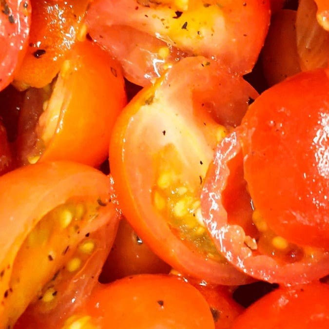 Shimeji grelhado, tofu, arroz japonês temperado (shari), tomate sweet grape, sunomono, crisp de couve e molho tradicional. Não é possível trocar nenhum ingrediente neste poke.