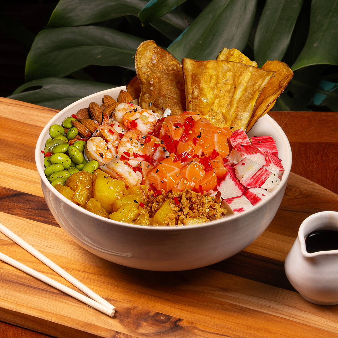Salmão, shimeji, arroz japonês temperado (shari), cream cheese, kani, cenoura, amendoim, crisp de couve e chips de batada doce. Molho ponzu. Não fazemos troca de itens nos pokes do chef.